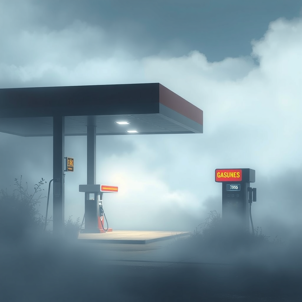 A highly detailed matte painting of a solitary gas station enveloped by mist, its lonely sign barely visible through the fog, evoking a serene and mystical atmosphere. Inspired by the styles of Studio Ghibli, Makoto Shinkai, Artgerm, WLOP, and Greg Rutkowski, it features soft, diffused lighting with volumetric effects that give the scene a dreamlike quality. Rendered in stunning 4K resolution, the piece showcases a blend of hyper-realism and fantasy, capturing the quiet beauty and solitude of the scene. The gas station's setting is slightly whimsical, with overgrown plants and ethereal lights casting a gentle glow. Despite its remote location, the station feels inviting and nostalgic. Artistic liberties are taken with subtle immersive elements, maintaining its core essence as a tranquil yet haunting masterpiece.