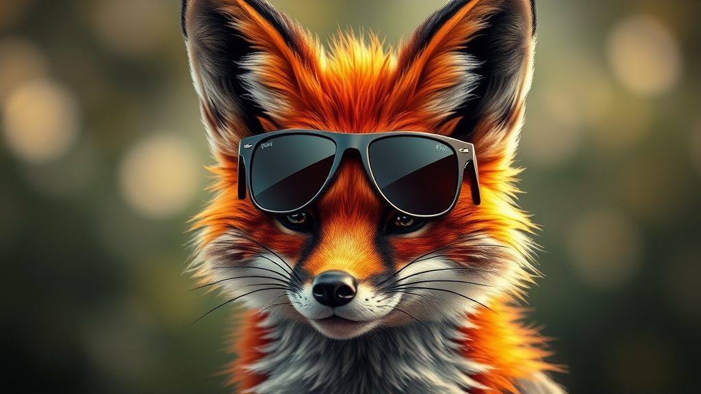 A highly detailed matte painting of a stylized three-quarters portrait features an anthropomorphic rugged and jovial fox sporting sleek sunglasses. The character exudes a charismatic and adventurous vibe, highlighted by its rich fur tones and playful expression. Its head, a seamless blend of animal and human features, takes center stage against a softly blurred bokeh background that adds depth and an ethereal quality, enhancing the enchanting essence of the scene.