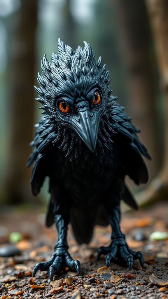 A highly detailed miniature of a Kenku crow character for a Dungeons & Dragons game, featuring intricate feather texture and vibrant coloring, set in a dramatic 3:4 aspect ratio. The Kenku has expressive eyes and is posed mid-movement, capturing its cunning nature with a backdrop of a mystic forest. The scene is in sharp focus, highlighting the nuanced craftsmanship and character's mysterious aura.
