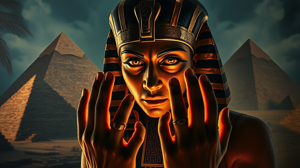 A highly detailed, mysterious Egyptian figure stands out with skindentation emphasized subtly, eyes bright and striking against the backdrop of ancient pyramids. The scene is photorealistic and cinematic, capturing the essence of a masterpiece. The lighting is dramatic, enhancing the enigmatic ambiance. This painting, with a touch of surrealism, showcases the artist's unique interpretation, adding a hint of the uncanny with imperfect but intriguing details in the figure's hands. The overall atmosphere evokes a sense of timeless mystery.