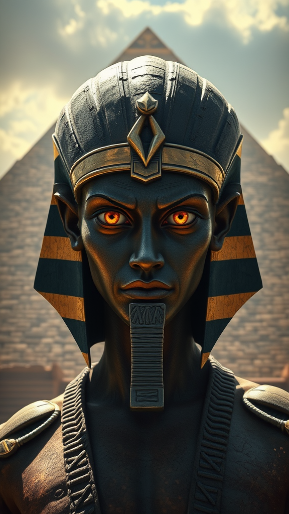 A highly detailed, mysterious Egyptian figure with vivid, bright eyes stands before an ancient pyramid, exuding an enigmatic aura. The scene is photorealistic and cinematic, showcasing an artistic masterpiece with dramatic lighting casting mesmerizing shadows. The intricate textures and patterns of the skin are emphasized, adding depth and intrigue. Despite deliberate imperfections, it retains a captivating allure, inviting viewers to explore the mysteries of the past through this evocative painting set against a timeless backdrop.