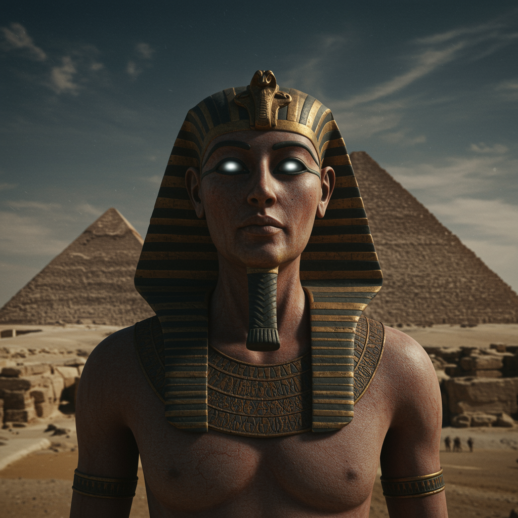 A highly detailed, mysterious Egyptian figure with bright, enigmatic eyes stands against the backdrop of ancient pyramids. The photorealistic scene is rendered in a cinematic style, capturing every contour and skindentation with mastery. The play of cinematic lighting accentuates the figure's features and adds depth to the historical setting, evoking a sense of timeless intrigue. The composition resonates with the grandeur of a masterpiece despite subtle imperfections, creating an aura of mystique and captivating allure.