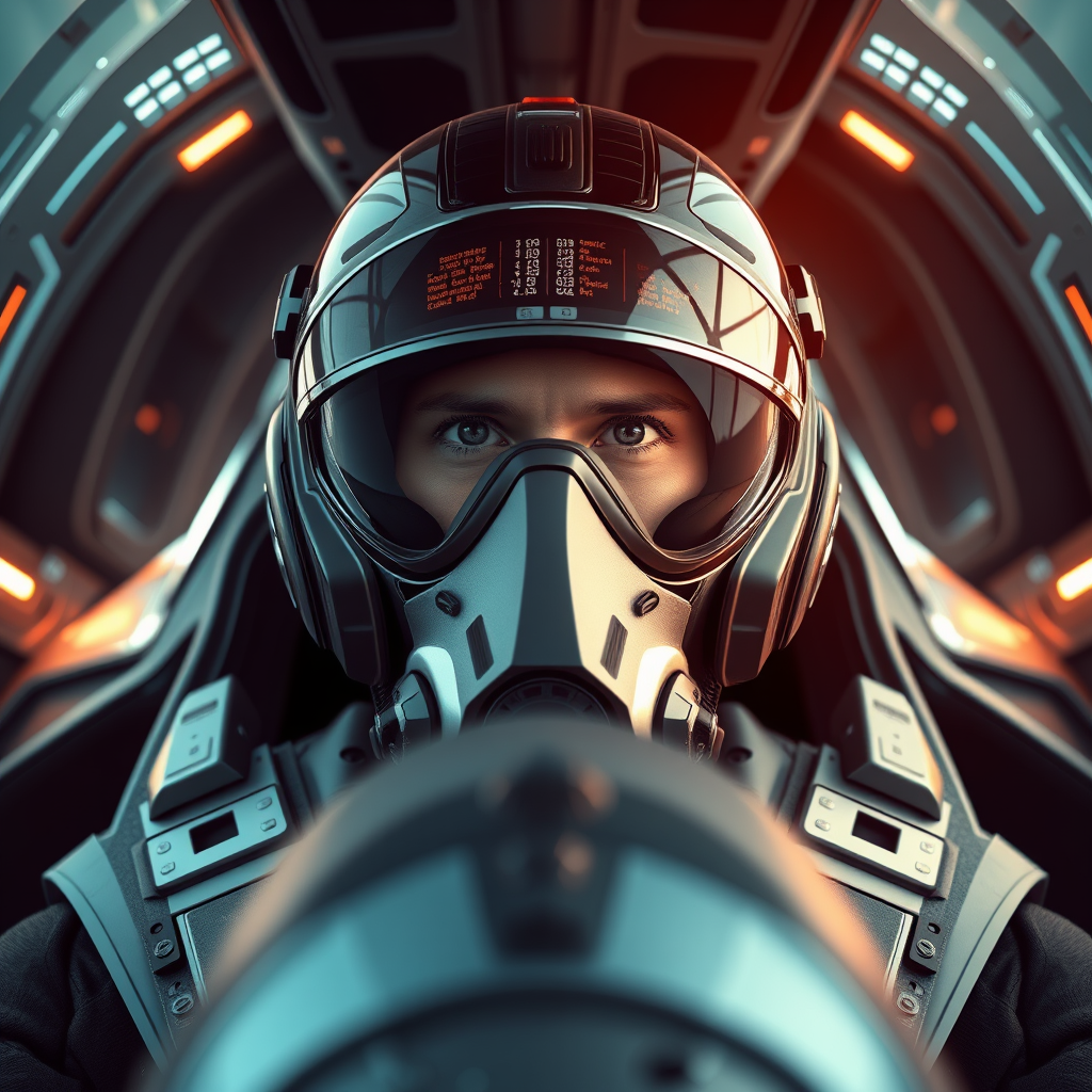 A highly detailed neofuturistic portrait illustration of a person clad in a sleek, advanced gas mask inside the cockpit of a streamlined fighter jet, with an augmented reality visor enhancing the futuristic aesthetic, capturing electronic displays reflected on the visor, 4K symmetrical portrait with subtle creative elements like ambient cockpit lighting and holographic interface controls.