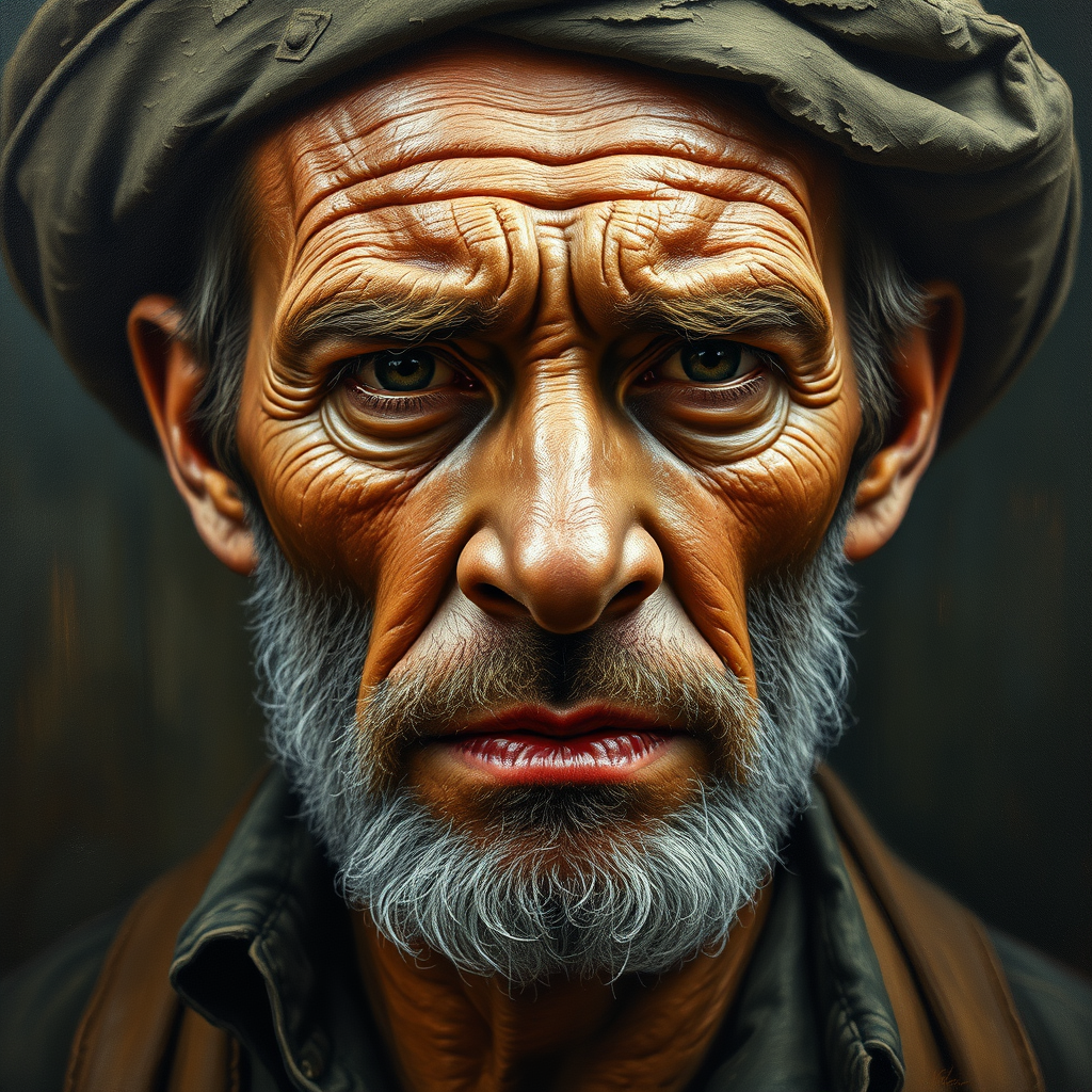 A highly detailed oil painting depicting a 19th-century male worker with a weary expression, capturing the essence of the era with heavy brushstrokes and textured impasto paint. The portrait is infused with cinematic lighting, highlighting the intricacies of the textured skin to create a dramatic effect. Inspired by the styles of Vittorio Matteo Corcos, Albert Lynch, and Tom Roberts, the artwork combines elements of realism and impressionism, focusing on the worker's rugged features. The composition is both intricate and expressive, designed to be visually striking and reminiscent of a masterpiece trending on art platforms, rendered in stunning 8k resolution.