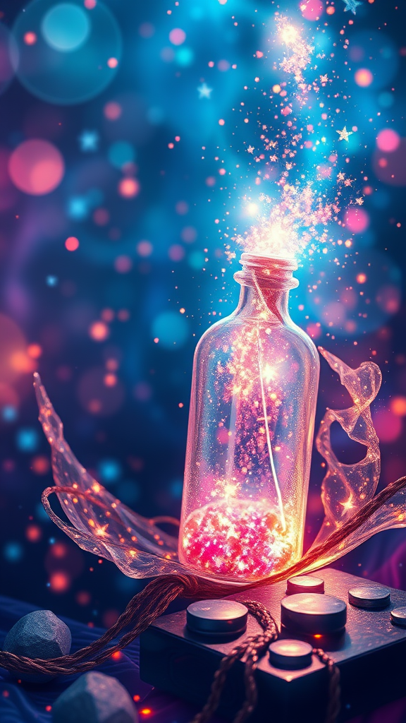 A highly detailed painting of a delicate magical fairy dust bottle emanating cosmic energy, capturing rich, deep colors and fantastical intricacy. The scene features complementary colors and fantasy concept art akin to trending styles on Artstation and Unreal Engine 5. The composition is inspired by anime key visuals, Japanese manga aesthetics, and platforms like Pixiv and Zerochan, with hyperrealistic and splash art elements. It presents a dynamic mid shot with intricate detail and dramatic color depth, focusing on a 2/3 face angle illuminated by side light. The colorful background brings a splash of SAI pixel art, creating an awe-inspiring tableau.
