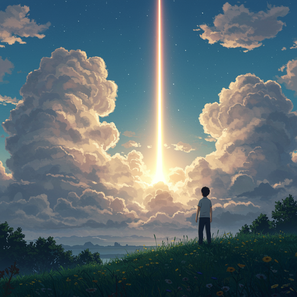 A highly detailed painting of a man standing on a hill gazing at a distant rocket launch. The scene captures the ethereal charm and vibrant colors reminiscent of Studio Ghibli and Makoto Shinkai, combined with the dynamic style of artists like Artgerm and WLOP. The landscape is illuminated by volumetric lighting, providing a dreamlike glow to the entire scenario, akin to a masterpiece rendered in 4K resolution. The backdrop reveals a sky filled with intricate cloud formations, with the fiery trail of the rocket adding a striking contrast. The man's expression is one of awe and wonder, his silhouette framed against the brilliance of the ascent. The environment around him is lush, detailed with subtle textures and depth, pulling viewers into an enchanting and fantastical world.
