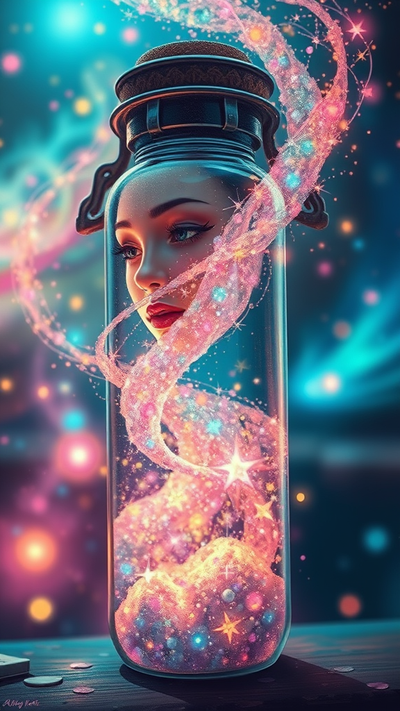 A highly detailed painting of delicate magical fairy dust swirling in a bottle, emanating cosmic magical energy, featuring deep and rich colors. This fantastical piece is infused with intricate details and complementary colors, creating a captivating fantasy concept art. With influences from Anime Key Visual and Japanese Manga, the piece is inspired by trending styles on platforms like Pixiv and Zerochan. It blends hyperrealism with anime aesthetics, incorporating elements seen in Fantia and splash art. The mid-shot composition captures a 2/3 face angle illuminated by dramatic side lighting, set against a vibrant and colorful background reminiscent of SAI Pixel Art. The artwork reveals an intricate dance of color depth and detail, merging traditional concept art with the fantastical allure of anime culture.