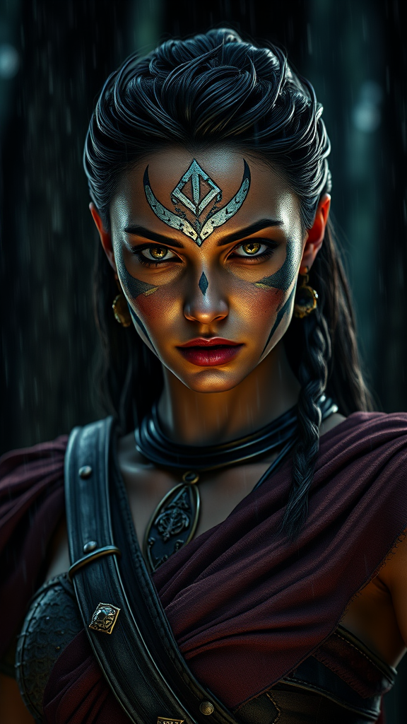 A highly detailed photo of a captivating Amazon warrior with a mesmerizing facial expression, wearing a meticulously handcrafted cloth outfit adorned with realistic war paint, set against a backdrop of dark woods under a rainstorm. The scene is illuminated with dramatic cinematic lighting, capturing the essence of concept art. Rendered in Unreal Engine 5 with RTX and ray tracing for a photorealistic effect, the image conveys an intense atmosphere. Subtle creative elements include the inclusion of a mystical aura surrounding her presence, giving the impression of power and mystery, as raindrops cascade around her, enhancing the ethereal quality.