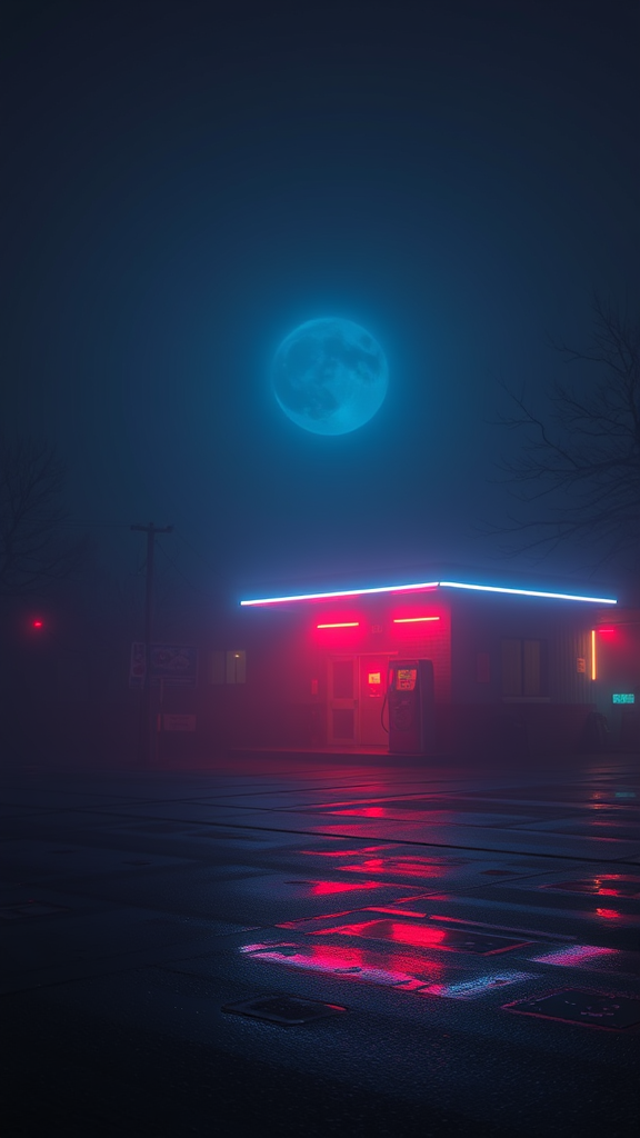 A highly detailed photograph of a lone gas station in the fog, illuminated by a neon blue light sign, evoking a sense of the 1980s. Enveloped in a mysterious, foggy atmosphere with a nostalgic red tint, the scene feels timeless, as if forgotten by the world. The overcast night sky adds to the moodiness, captured in stunning long exposure that accentuates reflections on the wet pavement. Neon lights cast an eerie glow reminiscent of Edward Hopper's works, emphasizing the mid-century American aesthetic. Surrounded by whispering trees, volumetric lighting creates a surreal ambiance. Rendered with octane-level realism, this 4K CGI masterpiece captivates with an award-winning, cinematic quality, trending on ArtStation—a hidden relic in the middle of nowhere.