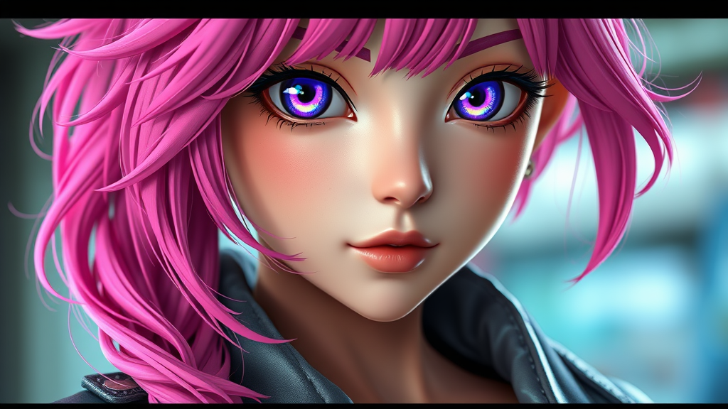 A highly detailed, photorealistic 3D render of a female character with vivid pink hair, wearing a stylish jacket, showcasing a realistic anime-inspired style. The close-up captures her expressive eyes and intricate facial features, blending realism with anime aesthetics. Her hair is a vibrant cascade, and the fabric of the jacket is meticulously detailed, reflecting light subtly. The character embodies both a unique, imaginative flair and a lifelike essence, balancing between an anime fantasy and real-world presence, resulting in an engaging and visually captivating female lead character concept.