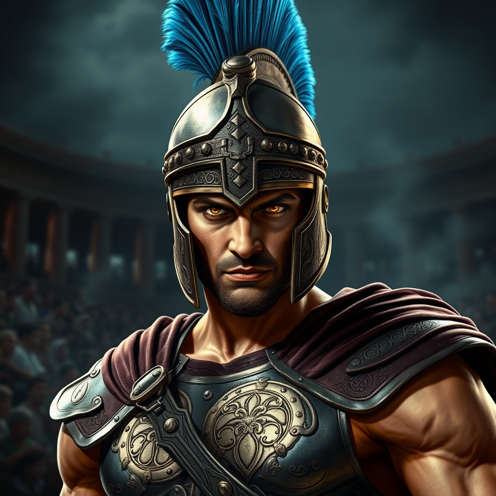 A highly detailed photorealistic digital illustration of a Roman gladiator, captured in a commanding and intense pose, locking eyes with the viewer. The gladiator is adorned with a traditional galea helmet, featuring intricate engravings and a striking azure plume. His muscular frame is protected by a lorica segmentata armor, showcasing elaborate patterns with a shimmering metallic finish. The gladiator's eyes blaze with a fierce, determined light, embodying courage and indomitable strength. The background is a dark, moody arena, where the shadows of the crowd and ancient architecture linger faintly, intensifying the dramatic and powerful atmosphere.