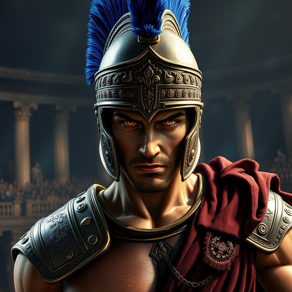 A highly detailed photorealistic digital illustration of a Roman gladiator, captured in an imposing and intense pose, locking eyes directly with the viewer. The gladiator wears a traditional galea helmet, showcasing elaborate engravings and a vibrant royal blue plume. His muscular form is protected by a lorica segmentata armor, embellished with intricate patterns and a metallic sheen. The gladiator's eyes shine with an intense, determined light, symbolizing valor and strength. The background features a dimly lit, moody arena, with subtle shadows of the crowd and ancient architecture, heightening the dramatic and powerful ambiance.
