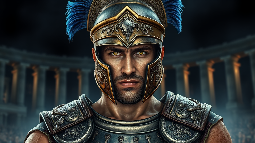 A highly detailed photorealistic digital illustration of a formidable Roman gladiator, captured in a commanding and intense pose, eyes locked directly onto the viewer. The gladiator wears a traditional galea helmet, adorned with intricate engravings and a striking azure plume. His robust physique is clad in a lorica segmentata armor, featuring exquisite embossments and a brilliant metallic sheen. The gladiator's eyes emit a fierce, determined light, embodying valor and resilience. The background reveals a dimly lit, atmospheric arena, with subtle outlines of a fervent crowd and ancient stone structures, intensifying the dramatic and powerful ambiance.