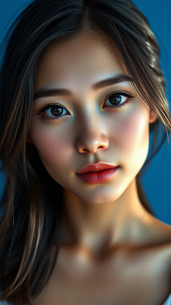 A highly detailed, photorealistic portrait featuring a woman with loose shoulder-length hair against a vibrant blue background. The image is captured in a cinematic frame with ultra-realistic rendering, showcasing subsurface dispersion and volume lighting effects. Her skin appears shiny and lifelike, emphasizing the intricacy of the details. The scene is rendered using advanced techniques like ray tracing and octane rendering, achieving an 8k resolution with an unreal engine quality finish. She has small breasts and prominently bushy eyebrows, contributing to the character's unique appearance. The overall presentation is of the highest quality, focusing on photorealism and artistic depth.