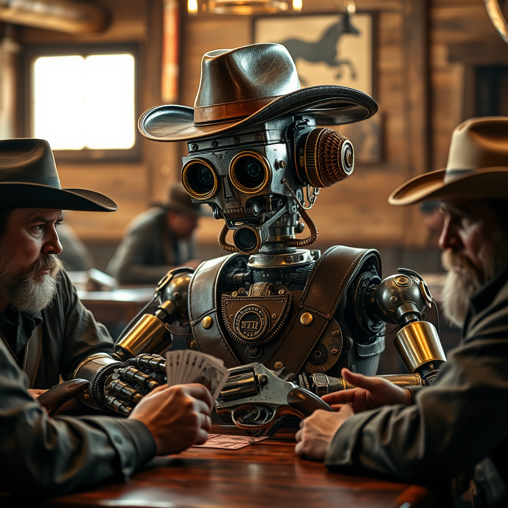 A highly detailed portrait captures a steampunk-inspired robot, intricately designed with brass and copper gears, engaging in a tense poker game in a classic Western saloon. The scene is filled with rustic charm, ambient light illuminating the wooden textures of the saloon's walls and tables. The robot, adorned with a weathered cowboy hat atop its metallic head and a leather bandolier, exudes a rugged yet futuristic allure. Its mechanical eyes scan the card opponents with precision, while one of its hands holds a set of cards and the other rests near a vintage revolver holstered at its side. Around the table, human cowboys with bushy mustaches and dusty hats sit in anticipation, creating a palpable atmosphere of competition and camaraderie. Shot in RAW with an 8k ultra-high-definition quality using a Fujifilm XT3 DSLR, the image captures every minute detail and texture, from the reflection on the robot's polished surface to the intricate grain of the saloon furniture, blending old Western nostalgia with a futuristic twist.