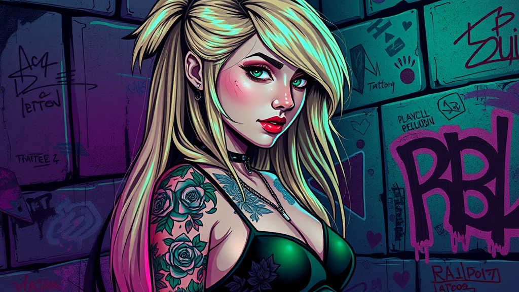 a highly detailed portrait of a blonde tattooed girl in a mini dress, inspired by the styles of atey ghailan, greg rutkowski, greg tocchini, james gilleard, joe fenton, and kaethe butcher, featuring a gradient color scheme of green, black, purple, and neon hues, set against a grunge aesthetic with a graffiti-tagged nightclub wall. Emphasize the vibrant and edgy atmosphere, capturing the essence of nightlife. Ensure the character is dynamic and expressive without falling into common pitfalls such as distorted anatomy or overly crowded composition, while maintaining clarity and balance in the artwork.