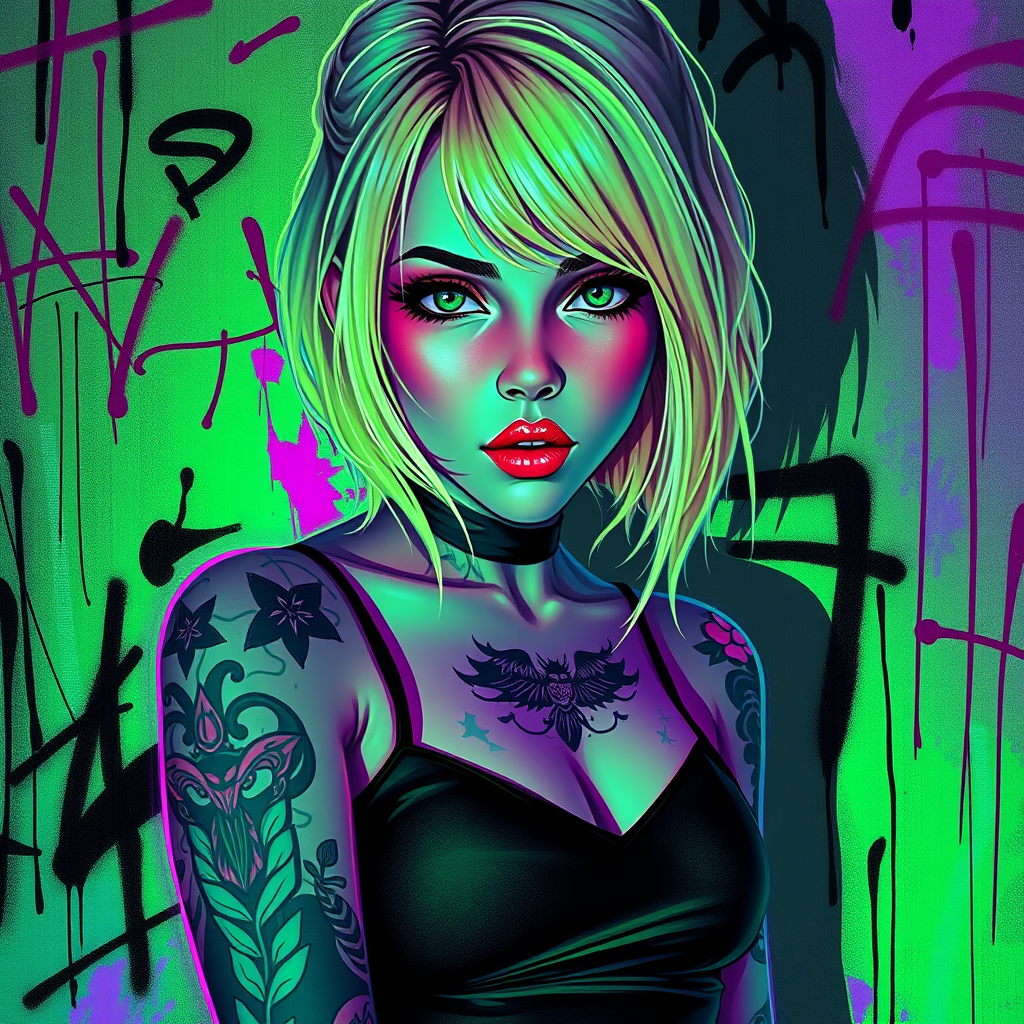 A highly detailed portrait of a blonde tattooed girl in a mini dress, inspired by Atey Ghailan, Greg Rutkowski, Greg Tocchini, James Gilleard, Joe Fenton, and Kaethe Butcher. The artwork features a vibrant gradient of green, black, and purple with a neon color scheme, embodying a grunge aesthetic. The background resembles a graffiti-tagged nightclub wall. The image embraces a slightly abstract and dreamlike quality, avoiding elements like high resolution, excessive detail, or perfect anatomy, while maintaining a creative interpretation. The composition focuses on the girl's expressive eyes, intricate tattoos, and the vibrant interplay of colors, ensuring a dynamic yet harmonious visual experience.