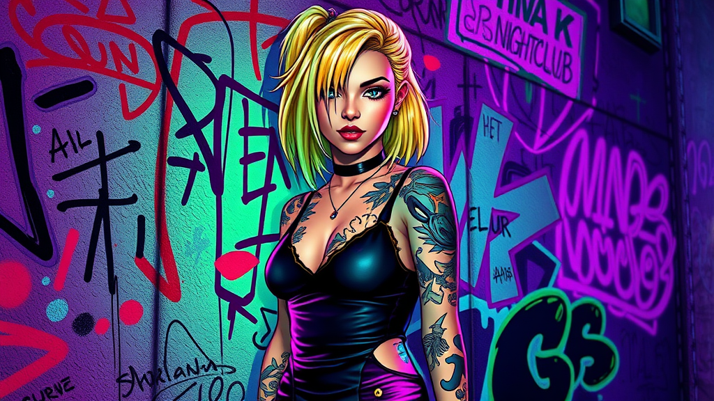 A highly detailed portrait of a blonde tattooed girl wearing a mini dress, inspired by the styles of Atey Ghailan, Greg Rutkowski, Greg Tocchini, James Gilleard, Joe Fenton, and Kaethe Butcher. The color scheme is a striking mix of gradient green, black, purple, and neon hues, exuding a grunge aesthetic. She stands against a graffiti-tagged nightclub wall that serves as the vibrant background. The scene is infused with an energetic yet edgy atmosphere, highlighting her unique style and confidence.