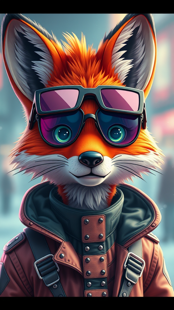 A highly detailed portrait of a cartoon fox sporting sleek sunglasses, rendered in vivid neonpunk style using photo-realistic techniques. The image is inspired by vray tracing and shot with a nostalgic konica big mini aesthetic. The fox is adorned in intricately designed costumes, set against a cold and detached atmosphere. The creation is captured in ultra-sharp 8k resolution, maintaining an extraordinary level of detail and focus. Subtle creative elements are incorporated to enhance the visual narrative, while preserving the essence of the original concept.