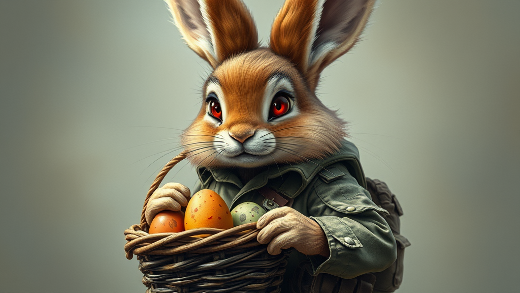 A highly detailed portrait of a charming bunny warrior, standing confidently with a basket of vibrant, colored eggs. His full, fluffy fur, marred by faint red blood stains, contrasts with the rugged WWII uniform he wears. His red eyes gleam with determination as he protects the precious cargo. The uniform, slightly weathered, complements his brave demeanor, and the eggs within the basket hint at a mission of hope. Despite the battle-worn appearance, the bunny's endearing features and determined stance create a captivating blend of strength and cuteness.