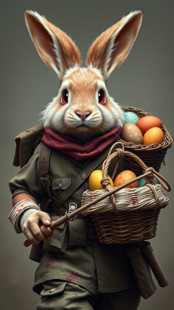 A highly detailed portrait of a courageous yet endearing anthropomorphic male bunny with soft, full fluffy fur and an array of vibrant colored eggs in a basket slung over his shoulder. This valiant warrior strides forward, his determined expression complemented by intense red eyes. His rugged World War II uniform is marked with red blood stains contrasting against his snowy fur. With fierce dedication, he protects the basket of eggs, a testament to his unyielding bravery. His floppy ears and twitching nose add a touch of warmth to his formidable appearance, blending the cuteness of his natural form with the somber reality of his battle-hardened resolve.