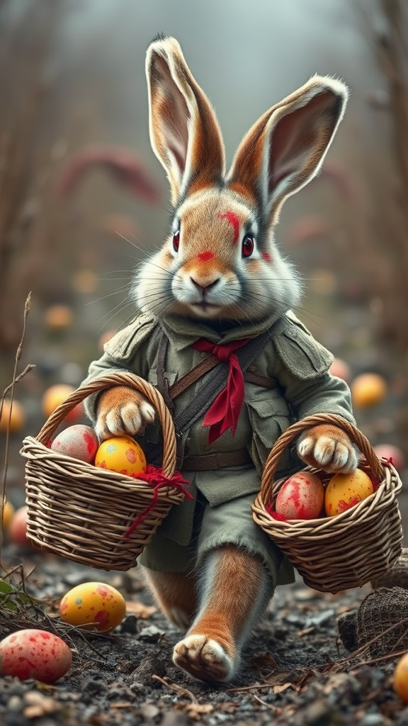 A highly detailed portrait of a cute and fluffy male bunny warrior, walking confidently while protecting a basket brimming with vibrant, colored eggs. The bunny is dressed in a rugged, tattered WWII uniform, its fur stained with vivid red blood, adding a stark contrast to its soft, full coat. Its red eyes burn fiercely with determination and a hint of mischief. The scene is set with a sense of intensity, as the bunny navigates through a surreal battlefield, embodying both the innocence of Easter and the grit of a seasoned protector.