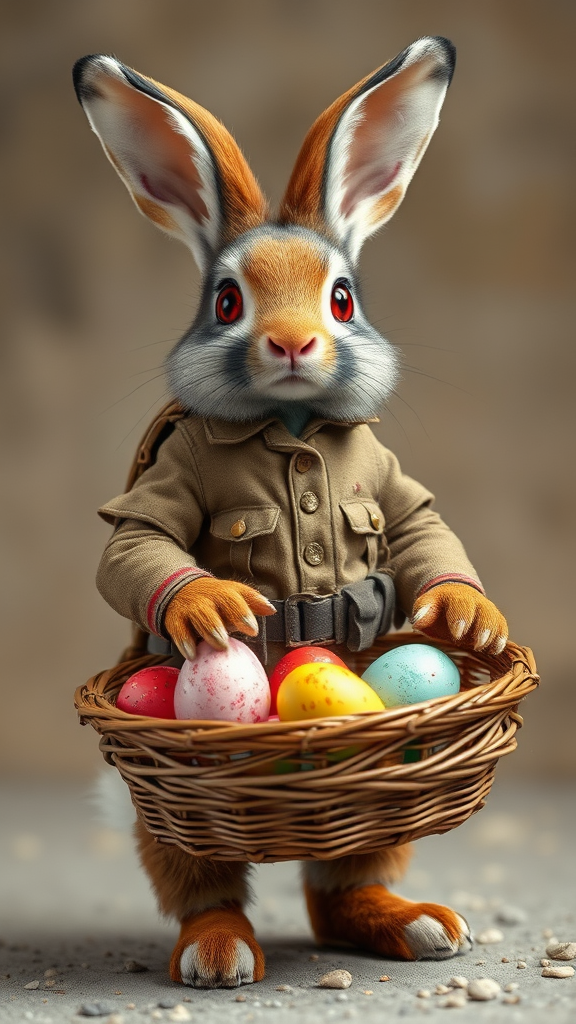 A highly detailed portrait of a cute anthropomorphic male bunny warrior on his hind legs, dressed in a rugged World War II uniform. His fur is full and fluffy, with crimson red eyes and subtle blood stains adding a fierce contrast to his innocent appearance. He guards a woven basket filled with vibrantly colored eggs, each gleaming under the soft light. His stance is protective and vigilant, ears perked up and alert, with hints of dirt and battle-weary scratches on his uniform. This juxtaposed image beautifully merges the innocence of Easter with the gritty valor of a seasoned soldier.