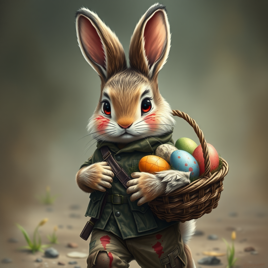 A highly detailed portrait of a cute bunny male, walking with confidence, dressed as a warrior from WWII. His fluffy fur is rugged and stained with red blood, contrasting sharply against his piercing red eyes. He carries a basket brimming with vibrantly colored eggs, each one meticulously painted. The bunny's expression is a mix of determination and tenderness as he protects his precious cargo. His WWII uniform, a patchwork of earthy tones, bears signs of battle, with torn patches and mud splatters telling stories of past skirmishes. Despite the gritty appearance, his demeanor is gentle, embodying the delicate balance between fierceness and care. The background hints at a world recovering from turmoil, with hints of green shoots symbolizing hope amidst the chaos.