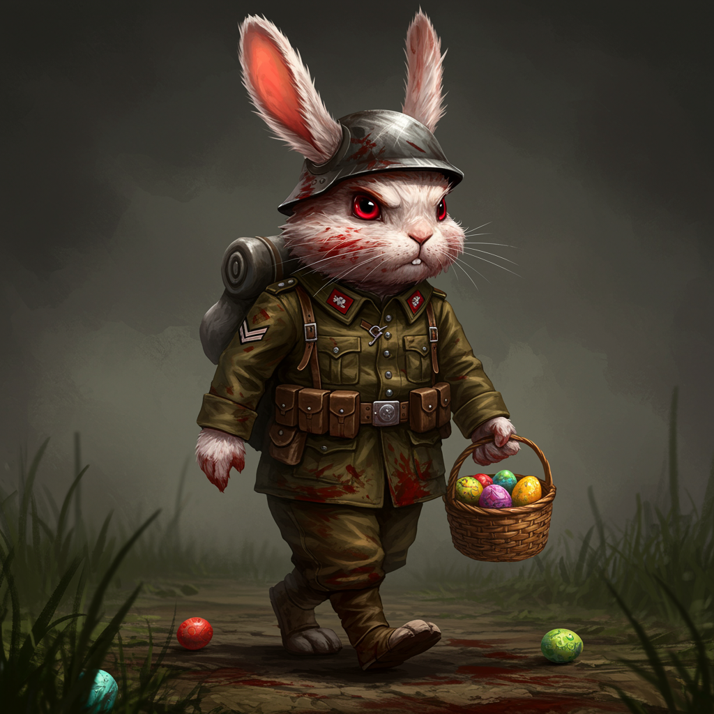 A highly detailed portrait of a cute bunny male warrior with a rugged WW2 uniform, walking with determination. He carries a basket tightly packed with colorful eggs, his duty to protect them evident in his intense stance. His fluffy fur, slightly matted in places, is marked with red stains contrasting against its softness. His eyes, a striking deep red, are sharp and focused, adding to his resolute aura. Despite the blood, his gentle nature peeks through, evident in the careful way he cradles the precious eggs. His journey is a paradox of tenderness amidst the chaos, a testament to the fierce yet endearing spirit of this unusual protector.