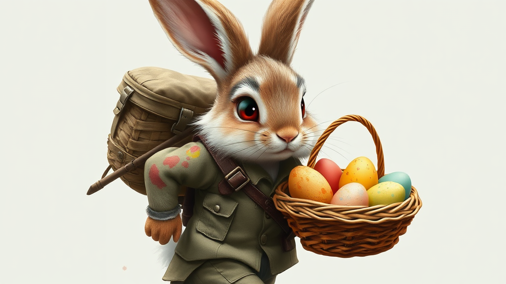 A highly detailed portrait of a cute bunny male with fluffy fur, wearing a rugged World War II uniform, walking with determination while carrying a basket filled with colored eggs. His crimson eyes show a fierce protective spirit, and his fur is stained with red blotches, hinting at battles fought to safeguard his precious cargo. The bunny, a warrior in spirit, strides with purpose, embodying a unique blend of cuteness and valor as he defends the vibrant eggs within his care against all odds.