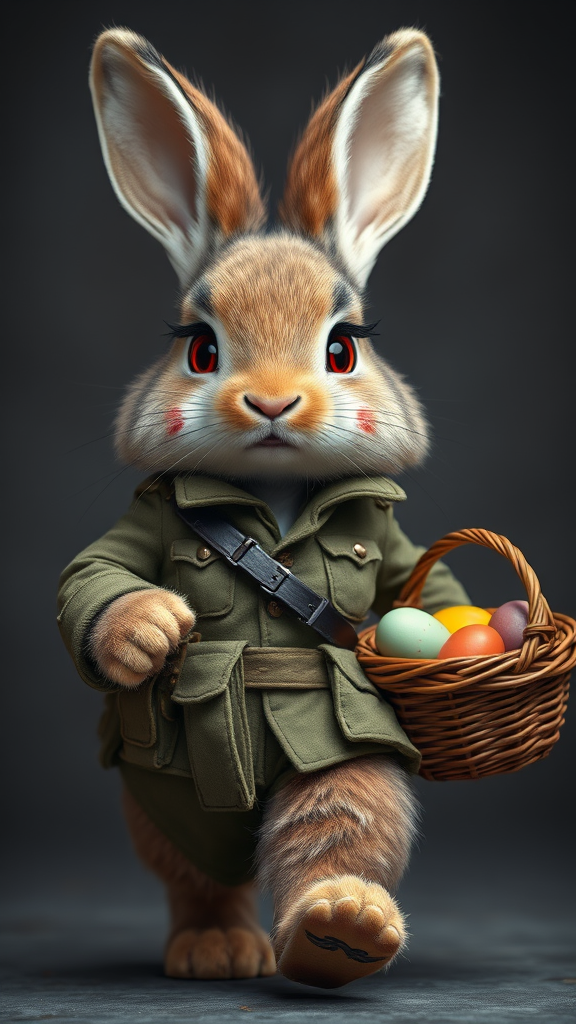 A highly detailed portrait of a cute male bunny striding confidently, his fur full and fluffy with a rugged texture, reminiscent of a wartime hero. Clad in a WWII-inspired uniform, his outfit shows the wear of battle with red blood stains subtly marking its surface. His piercing red eyes shine with determination, a fierce guardian of a basket brimming with vibrantly colored eggs, each egg a small treasure. The bunny's ears stand tall, twitching slightly as he remains ever alert, embodying a unique juxtaposition of adorability and stoic bravery. The colored eggs, symbolizing both hope and courage, indirectly highlight the bunny's role as a protector amidst chaos, while his overall demeanor suggests both vulnerability and strength, forming a striking visual of a warrior in an unusual world.
