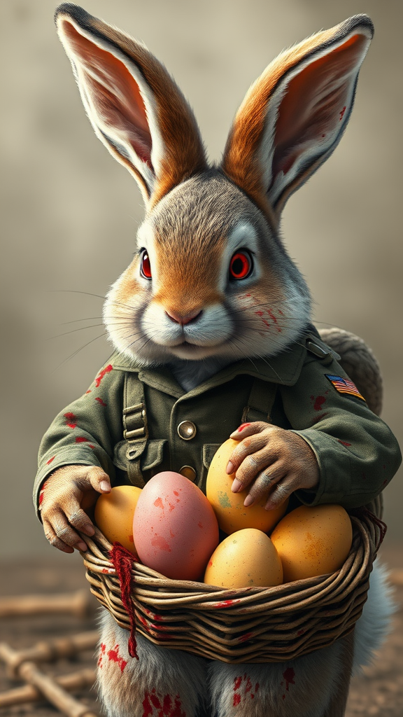 A highly detailed portrait of a cute male bunny warrior, walking with a basket full of colorful eggs, clad in a rugged World War II uniform. The bunny's soft, full fur is stained with red, contrasting starkly with his vivid red eyes that exude determination. He wields a protective stance over the basket, his fluffy exterior juxtaposed with the fierce blood stains marking his fur, telling tales of battles fought. His ears stand alert, and his expression is one of fierce guardianship, adding an element of valor to his adorable demeanor, as he patrols diligently to ensure the safety of the precious eggs.