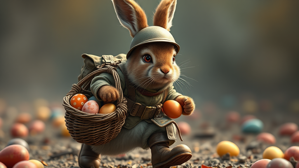 A highly detailed portrait of a cute male bunny warrior, striding confidently, clutching a basket brimming with vibrantly colored eggs. His fur is full and fluffy, though matted slightly with red blood stains, adding a rugged, battle-hardened edge to his appearance. His eyes are an intense shade of red, conveying both determination and a hint of fierceness. He dons a WWII-era uniform, complete with a helmet that sits snugly between his attentive ears, and sturdy boots suitable for rough terrains. Despite the chaos that surrounds him, he maintains a protective grip on his basket, ensuring the eggs he guards are kept safe. The scene is a unique blend of innocence and intensity, capturing the essence of a guardian tasked with a peculiar yet vital mission.