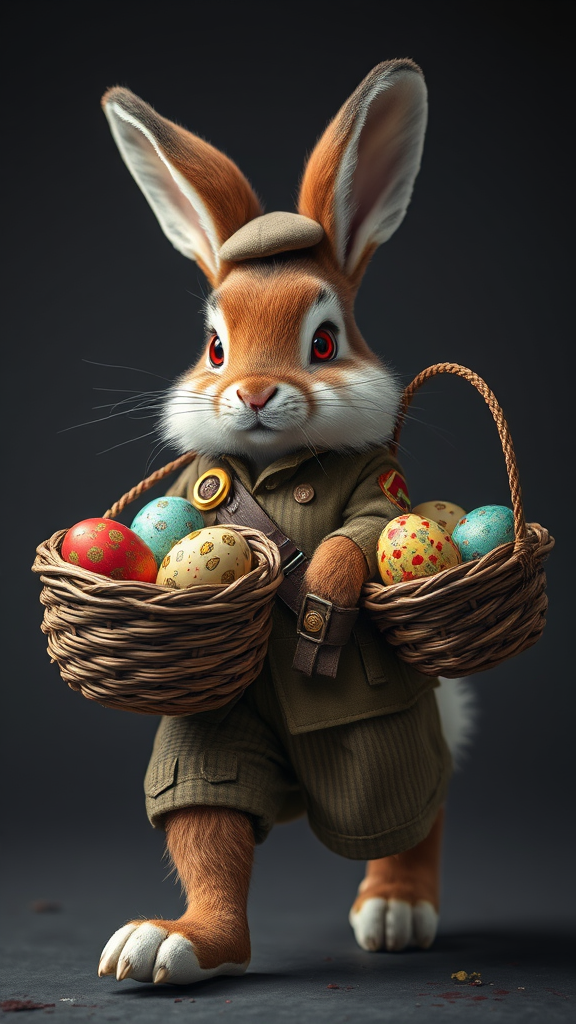 A highly detailed portrait of a cute yet fierce male bunny, striding forward with confidence, his fluffy fur stained with the crimson marks of battle. Clad in a rugged World War II uniform, his red eyes burn with determination as he carries an ornate basket filled with vividly colored eggs, each symbolizing hope and resilience. As a valiant warrior, he fiercely protects this precious cargo, his fur matted with blood from recent skirmishes. The juxtaposition of his soft, full fur against the harsh reality of war highlights his resolve and vulnerability, creating a striking image of bravery and tenderness in a tumultuous world.