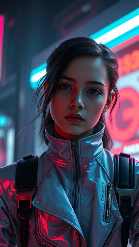 A highly detailed portrait of a European young girl wearing a futuristic sci-fi fashion movie jacket coat, inspired by royal attire and designed with the aesthetics of Ismail Inceoglu, Dragan Bibin, and Greg Rutkowski. The scene is a blend of cyberpunk and Neotokyo synth-wave, capturing the essence of a Bladerunner movie scene with dramatic and high-contrast lighting. The girl's face is flawless with a sharp chin and realistic shading, showcasing a pretty, finely detailed appearance. Set against a low-emission-neon backdrop, the image evokes a sense of futurism with a rich color scheme and hyper-realistic textures. The high-resolution, ultra-detailed 8K image uses physics-based rendering to create a lifelike photograph, shot with an f1.6 lens for ultimate realism. The composition is a fusion of CGI, 3D, and digital art, blending elements of illustration and digital painting. The image avoids flaws such as poor anatomy or deformations, ensuring a clean representation with a focus on perfection and elegance.