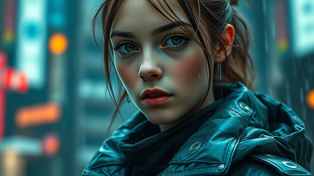 A highly detailed portrait of a European young girl wearing a storm rain movie jacket coat, embodying futuristic sci-fi fashion with elements of royal attire. Inspired by the works of artists such as Ismail Inceoglu, Dragan Bibin, Hans Thoma, Greg Rutkowski, Alexandros Pyromallis, Nekro, Rene Magritte, the portrait features a perfect face with a sharp chin and fine details, showcasing realistic shading and a pretty face. Set against a cyberpunk, neotokyo synth-wave aesthetic reminiscent of a Bladerunner movie scene, the image is brought to life with dramatic lighting. The portrait, captured as a high detail RAW color photo, emphasizes ultra-realistic textures and rich colors, using a physics-based rendering approach. The composition highlights hyper-realism and high contrast, shot with an f1.6 lens to ensure lifelike detail in a professional photography style. The overall effect is a highly detailed 8K wallpaper with cinematic qualities, blending CGI, digital art, and illustration elements to create a vivid portrayal without imperfections such as distortion, poor proportions, or unrealistic anatomy.