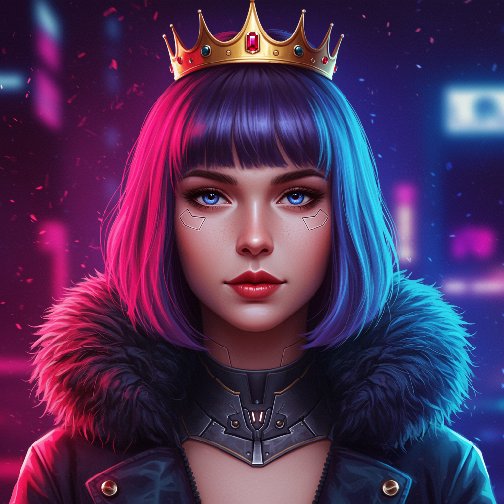 A highly detailed portrait of a European young woman wearing a stylish Storm Rain movie jacket coat, blending futuristic sci-fi fashion with royal attire. Inspired by the works of Ismail Inceoglu, Dragan Bibin, Hans Thoma, Greg Rutkowski, Alexandros Pyromallis, Nekro, and Rene Magritte. Her face is perfect, with a sharp chin and fine details, showcasing realistic shading. The fusion of a pretty face with cyberpunk and neotokyo aesthetics, synth-wave influences, and a futuristic, low-emission neon glow reminiscent of a Bladerunner scene. The artwork is crafted in CGI, with elements of a 3D doll, cartoon, anime, and illustration, resulting in a captivating digital painting. The portrait is vibrant, with no text or logos, maintaining perfect proportions and a focus on facial features. Her expression is confident and mysterious, capturing the essence of a sci-fi world with a touch of royalty.
