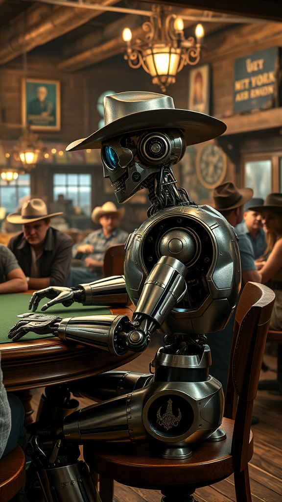 A highly detailed portrait of a futuristic robot seated at a poker table in a lively classic western saloon, surrounded by patrons wearing cowboy hats and old-style clothing. The saloon is filled with rustic charm, with wooden floors and vintage decor. The robot, with a metallic sheen, sports its own cowboy hat tilted slightly to one side and has intricately designed joints that mimic human gestures as it holds a deck of cards. On its side, a decorative revolver is holstered, adding to its western persona. The atmosphere is illuminated by warm, ambient lighting, casting soft shadows that highlight the textures of the scene. The image is captured in RAW format, achieving 8k UHD resolution with a DSLR-like quality lens reminiscent of a Fujifilm XT3, ensuring every detail is crisp and vibrant, bringing the unique fusion of futuristic and classic elements to life.
