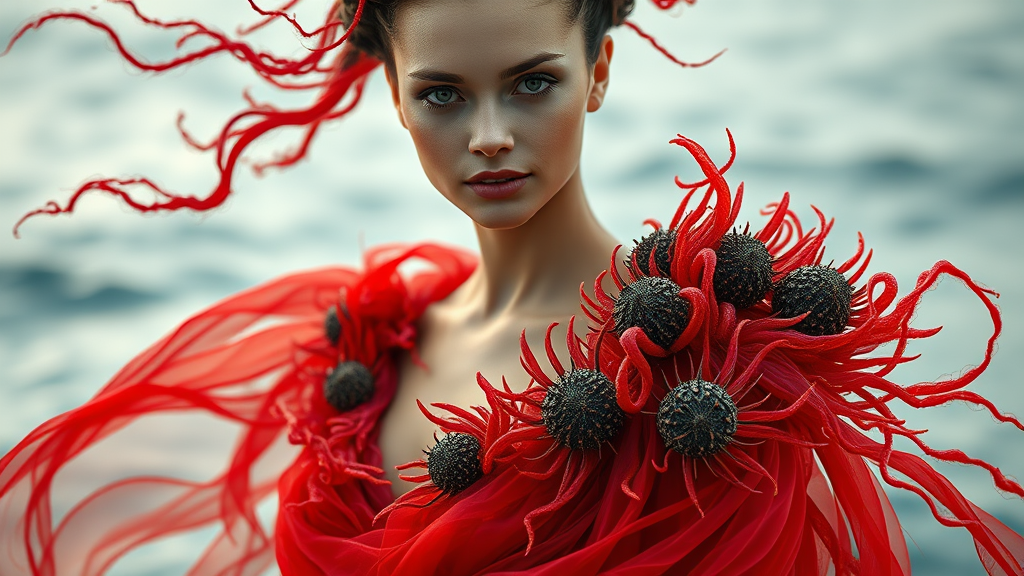 A highly detailed portrait of a goddess with hyper-realistic facial features, she stands gracefully in a vivid red dress woven from sea urchins and delicate anemone tentacles, her garment flowing like liquid silk. The intricate textures of her attire contrast with her serene expression, creating a balance between elegance and the wild beauty of the ocean. The image captures a full-body view, enhanced by a shallow depth of field that softly blurs the distant seascape, drawing focus to her captivating presence.