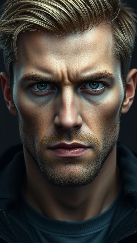 A highly detailed portrait of a man with dark blond hair and a prominent nose, clean-shaven, with meticulously rendered facial features. The expression is serious, capturing both intensity and depth. He is dressed in contemporary attire, focusing on his upper body—specifically head and shoulders. The artwork embodies an 8k resolution concept art style, drawing inspiration from the works of dmc_kay and WLOP. It features dynamic and volumetric lighting that accentuates the intricate details of the face. The composition makes use of a triadic color scheme, bringing in a sense of balance and harmony. The piece is hyperdetailed, with elements of Splash art, and is currently trending in the art world.