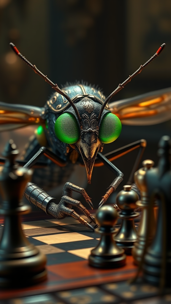 A highly detailed portrait of a mosquito with large, vibrant green eyes, sitting at a table engrossed in a game of chess. The mosquito is adorned in intricately designed armor that glimmers under a cinematic light, adding a dramatic atmosphere to the scene. The setting is filled with an array of rich textures and vivid details, from the carved chess pieces to the subtle expressions of thoughtfulness on the mosquito's face, capturing its strategic engagement.