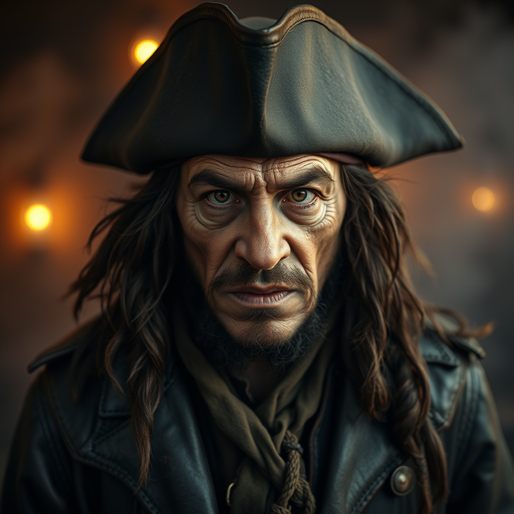 A highly detailed portrait of a pirate, showcasing a half body shot with an unsettling and intimidating presence. The pirate's face is marked by deep wrinkles spreading from the mouth and cheeks, accentuating its ugliness and scariness. His dark, greasy hair is unruly and wild, lending an air of authenticity and roughness. He is wearing a deformed black felt pirate hat that sits askew, adding to his menacing appearance. His winter leather coat is intricately designed, hinting at his storied past. The pirate stares directly at the camera with a gloomy expression, captured in a centered composition akin to promotional art. The visual style is inspired by the artistic touch of Alessandro Casagrande, Greg Rutkowski, and Sally Mann, with an emphasis on sharp focus and intricate details. The scene is bathed in soft, cozy indoor lighting, blended with the magical hues of a sunset, offering a cinematic ambience reminiscent of a f/1.8 aperture at 85mm focal length. Medium shot composition enveloped in ethereal volumetric fog, suggesting a scene trending on Tumblr. The HDR quality at 4k resolution pushes the boundaries of photo realism and ultra-detailed portrait photography, capturing the dramatic essence and texture akin to octane rendering.