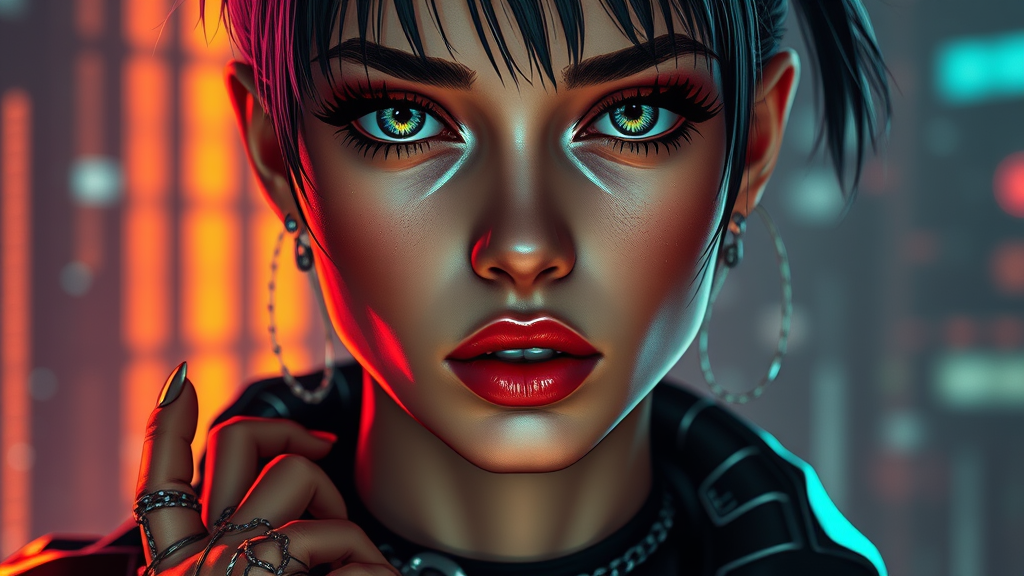 A highly detailed portrait of a punk girl with edgy, cyberpunk-inspired features, showcasing a holographic sheen in her futuristic sci-fi fashion style. Her aesthetics capture the essence of synthwave and the nostalgic, gritty vibe reminiscent of a Blade Runner movie scene. The artwork brings to life a perfect face with striking details, exhibiting fine and precise shading to highlight her sharp chin and captivating presence. This visually stunning piece is inspired by the works of Ismail Inceoglu, Dragan Bibin, Hans Thoma, Greg Rutkowski, Alexandros Pyromallis, Nekro, and René Magritte. The composition ensures anatomical accuracy, featuring well-proportioned limbs and hands, avoiding duplication or deformities. Her distinctive features are complemented by subtle, creative deviations from the core concept, ensuring a uniquely vibrant yet realistic portrayal.