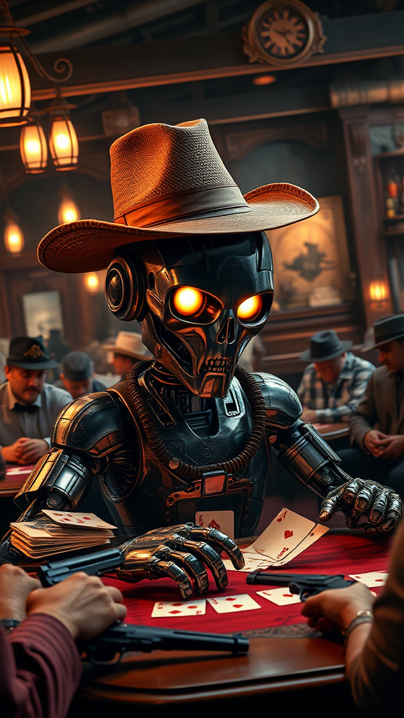 A highly detailed portrait of a robot with an intricate metallic design playing poker in a bustling classic western saloon, surrounded by tables of boisterous patrons. The robot wears a weathered cowboy hat tilted jauntily on its head, and its eyes glow with an artificial intelligence as it analyzes the cards it's been dealt. The room is filled with the warm glow of hanging oil lamps and the sound of a vintage piano playing in the corner. In the background, players have their revolvers casually resting on the tables, and a plume of cigar smoke wafts through the air. The scene is captured with a Fujifilm XT3 in RAW photo format, emphasizing the intricate details and textures in 8K UHD resolution, delivering stunningly high-quality visuals that bring the saloon to life.