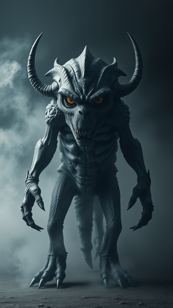 A highly detailed portrait of a stop monster standing front-facing in sharp focus. The creature exudes an aura of warning, evoking a sense of retreat and return. Surrounding the monster is a mystical volumetric fog, adding depth and mystery to the scene. The symmetrical balance of its features creates an intimidating and otherworldly presence. Its intense gaze seems to communicate a silent command to halt and wait, while intricate textures and details enhance the eerie atmosphere.