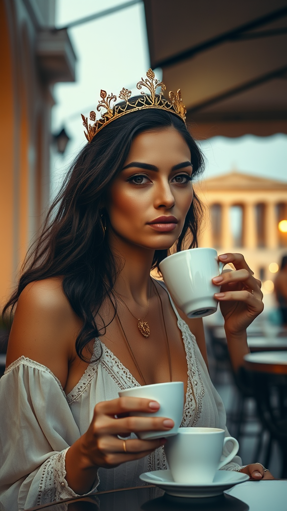A highly detailed portrait of a woman in a boho-inspired outfit, seated at a street café in modern Athens. She wears a delicate gold crown resembling Greek laurels, sipping coffee with a tranquil expression. The dusky glow casts a soft light, highlighting her features, as a blurred silhouette of the Parthenon looms in the background, evoking a sense of timeless elegance and cultural fusion.