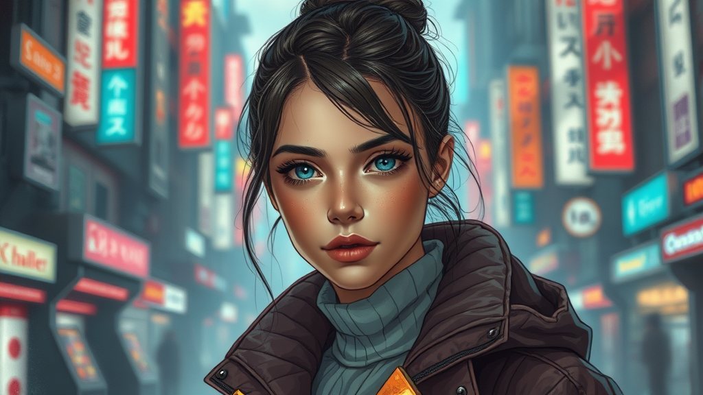 A highly detailed portrait of a young European girl, showcasing futuristic sci-fi fashion with a storm rain movie jacket coat. Her attire exudes a regal essence, influenced by the artistic styles of Ismail Inceoglu and Dragan Bibin with a touch of Hans Thoma's and Greg Rutkowski’s creative flair. The girl displays a perfect face with a sharp chin and fine details, reminiscent of a cyberpunk aesthetic set in a neon-lit, Blade Runner-inspired neo-Tokyo cityscape, combining synth-wave and low-emission neon visuals. The illustrative portrait captures a blend of CGI, digital art, sketch, and cartoon elements, focusing on creating a remarkable and pretty face without falling into common pitfalls such as poorly drawn features, unrealistic proportions, or disfigured elements. The futuristic and surreal environment is finely detailed, emphasizing her unique and elegant appearance amidst a modern, dystopian backdrop.