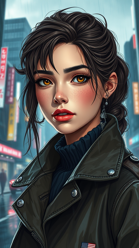 A highly detailed portrait of a young European girl with striking beauty, clad in a stylish movie jacket coat under a stormy rain, featuring a blend of futuristic sci-fi fashion and royal elegance. Drawing inspiration from artists like Ismail Inceoglu, Dragan Bibin, Hans Thoma, Greg Rutkowski, Alexandros Pyromallis, Rene Margitte, and Nekro, the illustration showcases a flawless face with sharp features, finely detailed and realistically shaded. The aesthetics are cyberpunk and neotokyo-inspired, with a synthwave vibe accentuated by low-emission-neon lighting reminiscent of a Blade Runner movie scene. Despite the futuristic vibe, the attire maintains a sense of regality. The background is a dynamic cityscape with a blend of modern and retro elements. The overall composition avoids imperfections such as jpeg artifacts, low quality or errors, ensuring an image free from distortions or inaccuracies like extra limbs or malformed anatomy.