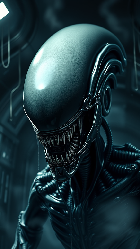 A highly detailed portrait of an alien creature inspired by the Xenomorph from the Alien movies, featuring a sleek, elongated head with a smooth, dome-like surface, completely devoid of visible eyes, which gives it an eerie and unsettling look. The creature's mouth is filled with short, razor-sharp metallic teeth and features a secondary set of teeth protruding from within like a small, menacing black box. Its skin is a glossy, obsidian exoskeleton that reflects light menacingly, adorned with biomechanical ridges and tubes stretching along its head and neck. The background presents a dark, industrial spaceship environment with metallic walls, dripping water, and swirling steam, enhancing the creature's sinister presence. The lighting casts deep shadows on the alien's features, highlighting its terrifying, otherworldly essence, creating a spine-chilling atmosphere.