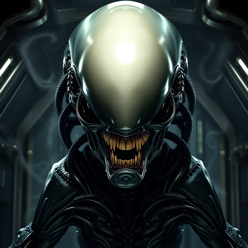 A highly detailed portrait of an alien creature reminiscent of the Xenomorph from the Alien movies, featuring a sleek, elongated head with a smooth, dome-like surface devoid of visible eyes, creating an eerie, unsettling presence. Its mouth is lined with short, razor-sharp, metallic teeth, with a smaller set of teeth protruding like a black, toothed box from within. The creature's skin is a glossy, black exoskeleton that sinisterly reflects light, with intricate biomechanical ridges and tubes weaving along its head and neck. It stands in a dark, industrial spaceship environment, with metallic walls glistening with dripping water and wisps of steam swirling around, enhancing its menacing aura. The lighting casts deep shadows that accentuate the alien's terrifying, otherworldly features.